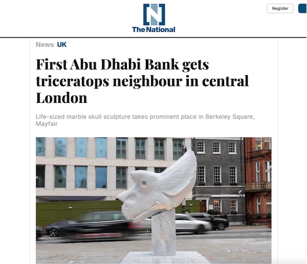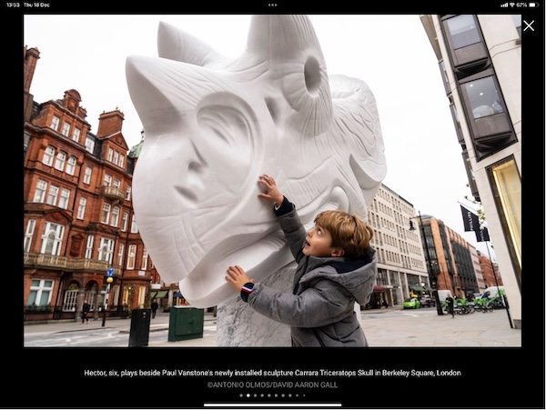 Hector, six, plays beside Paul Vanstone’s newly installed sculpture Carrara Triceratops skull in Berkeley Square, London